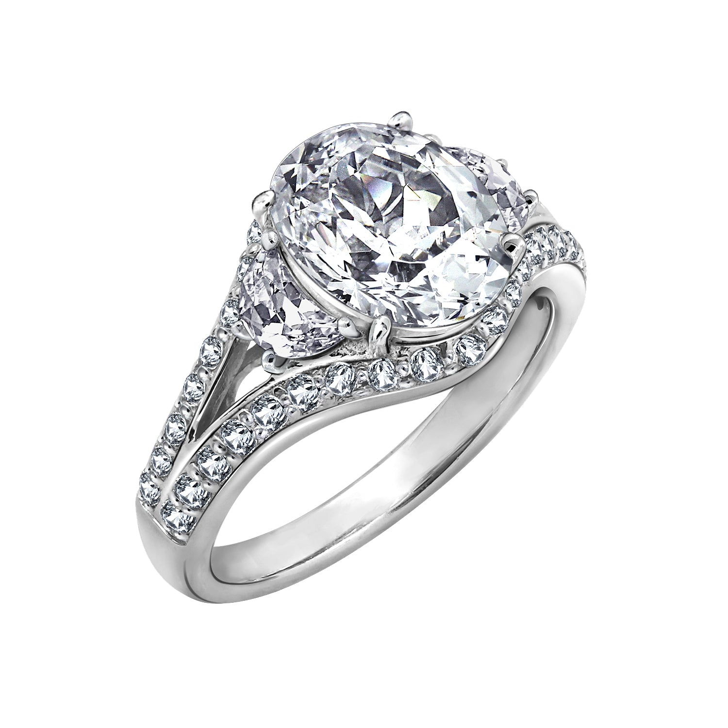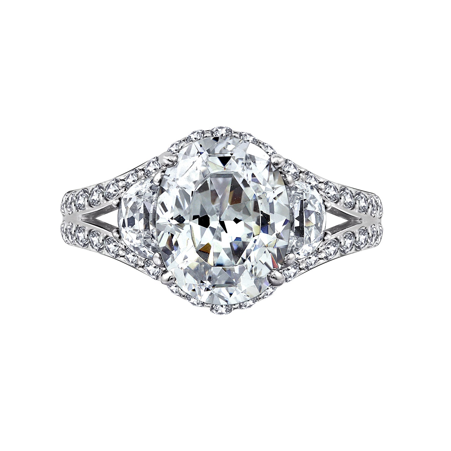 100-Facet Oval Cut with Half Moon Side Stones Split Shank Ring