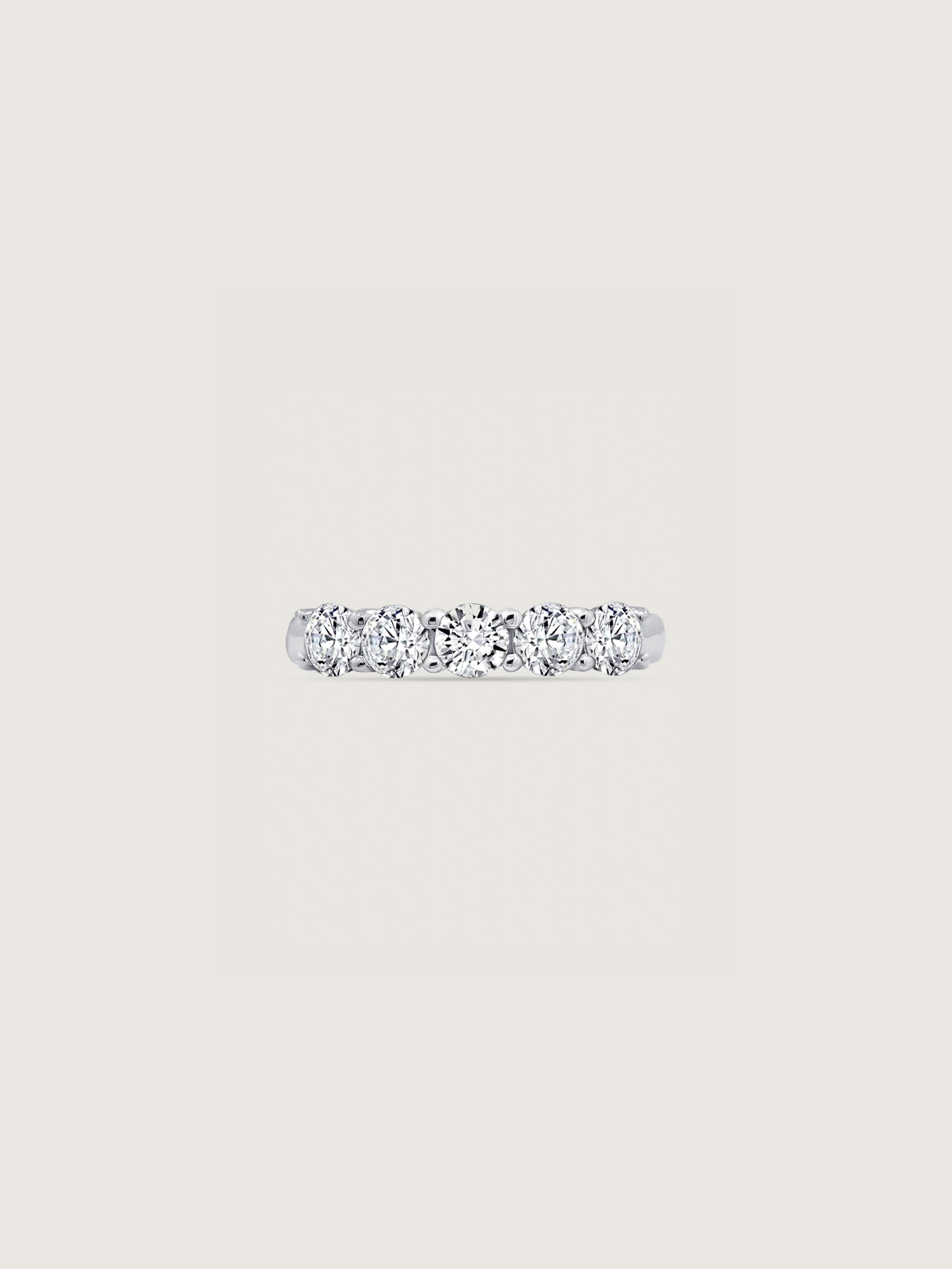Expertly crafted and designed with precision, the 100-Facet Round 5-Stone Ring showcases a sparkling 4mm round-cut Cubic Zirconia stone. Enjoy the brilliance and shine of this timeless piece, perfect for any occasion.