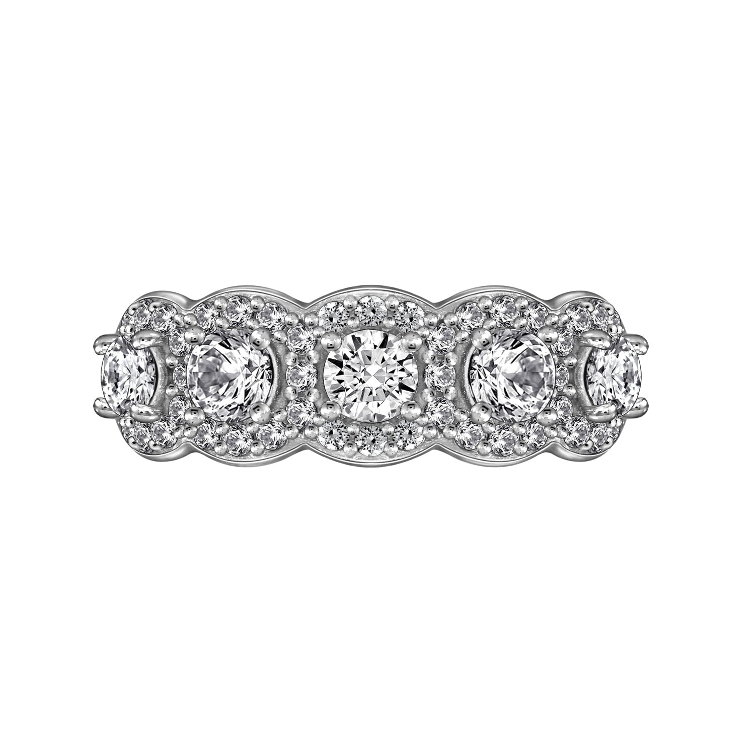 Elevate your style with this 5-Stone Halo Ring. Designed with round-cut cubic zirconia and halo stones, it exudes elegance and sophistication. Made of sterling silver and plated in platinum.