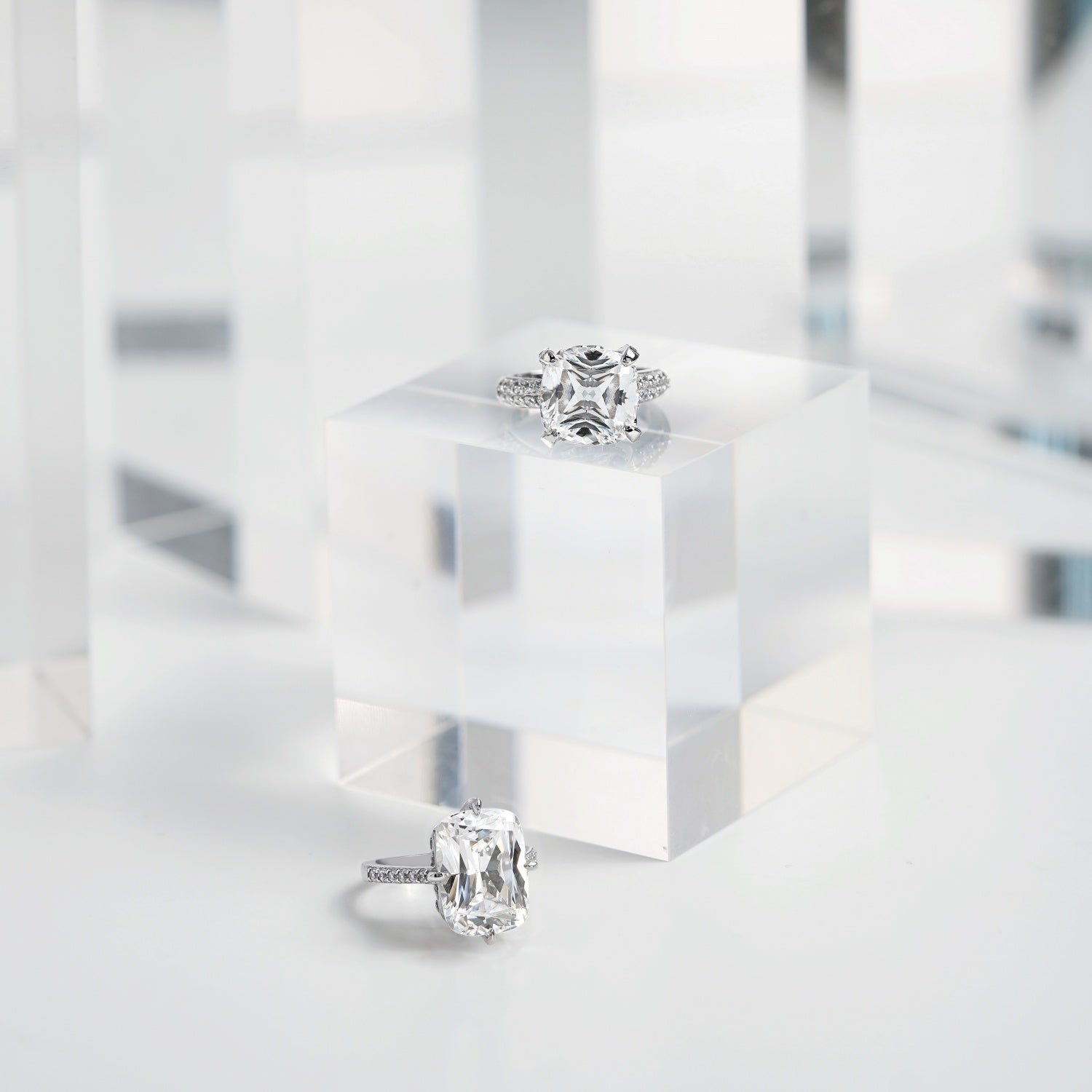 Prong-set Emeral-cut with Round-cut Cubic Zirconia |