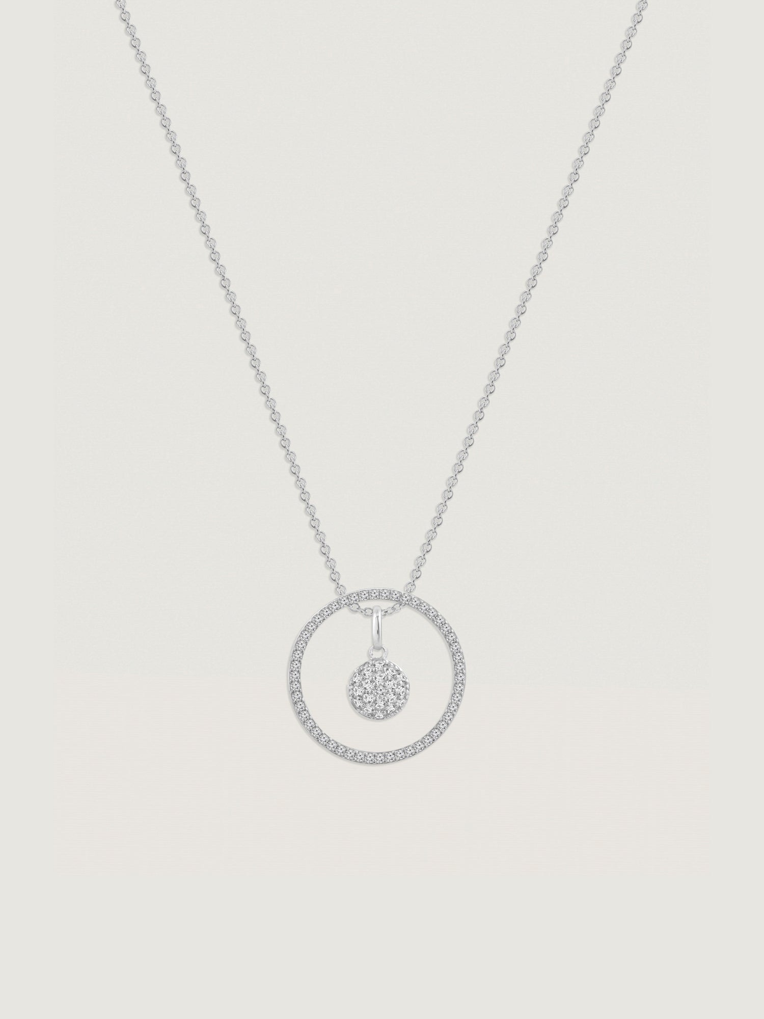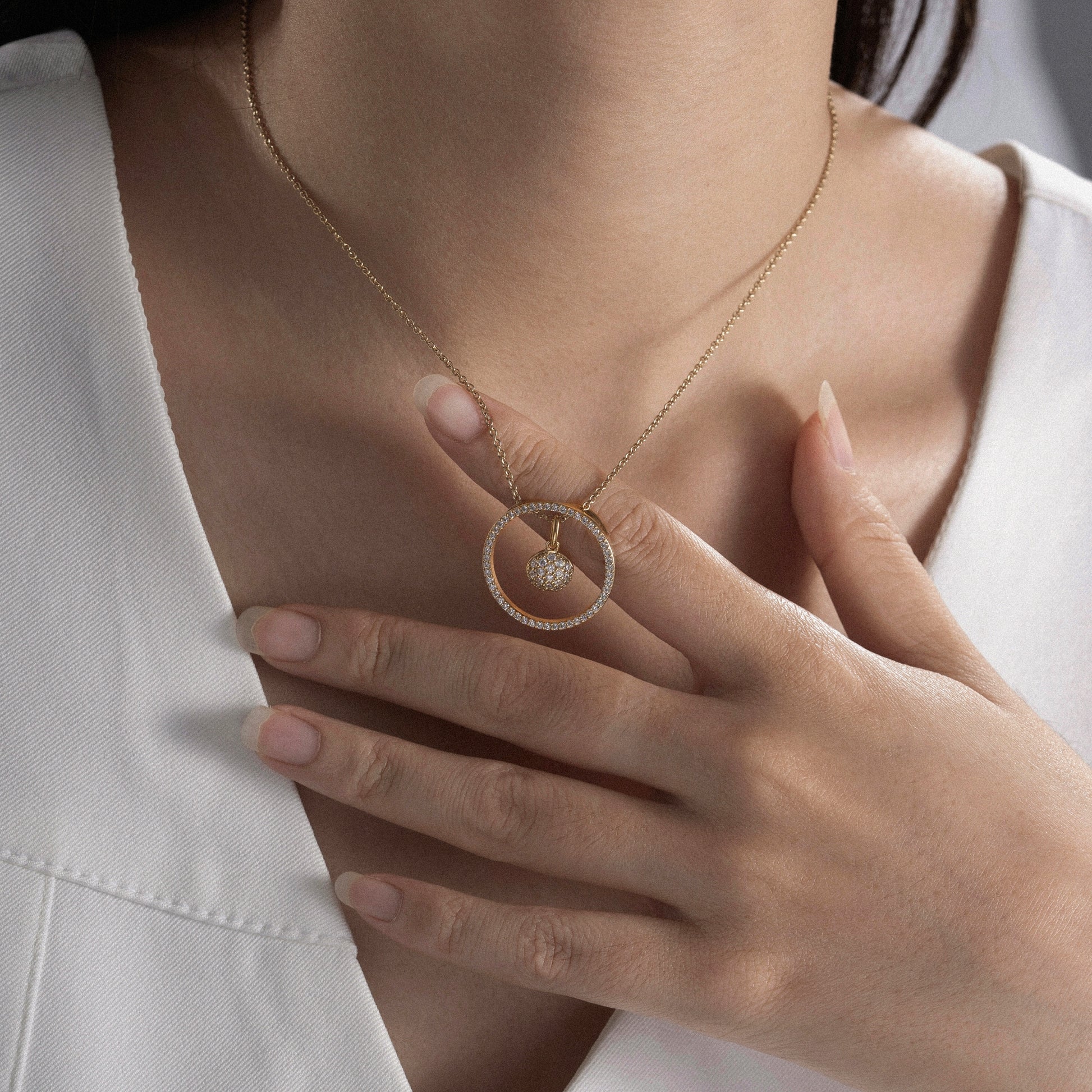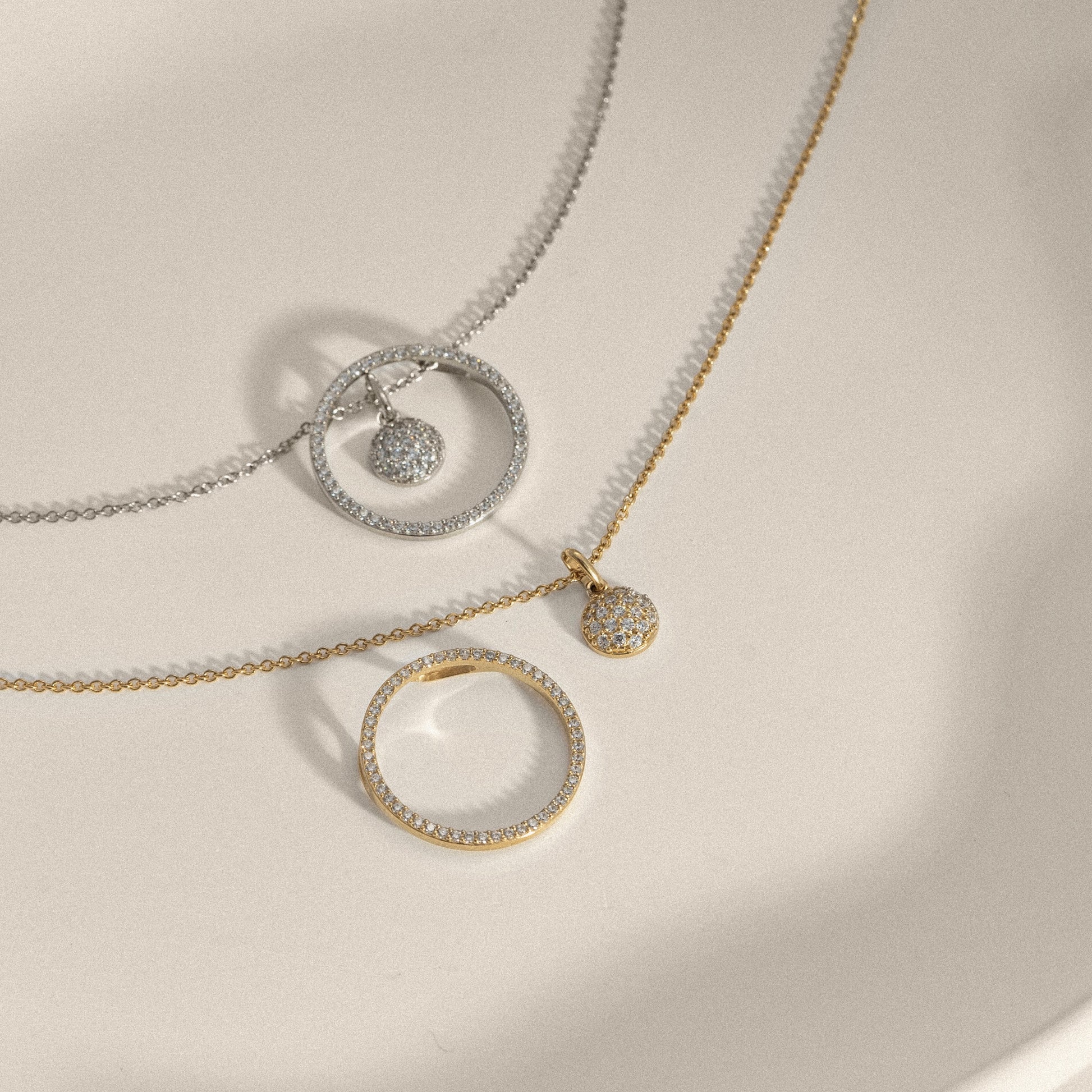 One piece, three ways to wear. Wear it with the classic pavé round pendant or the hollow round pendant for everyday elegance, or put them together for a more glamorous look.