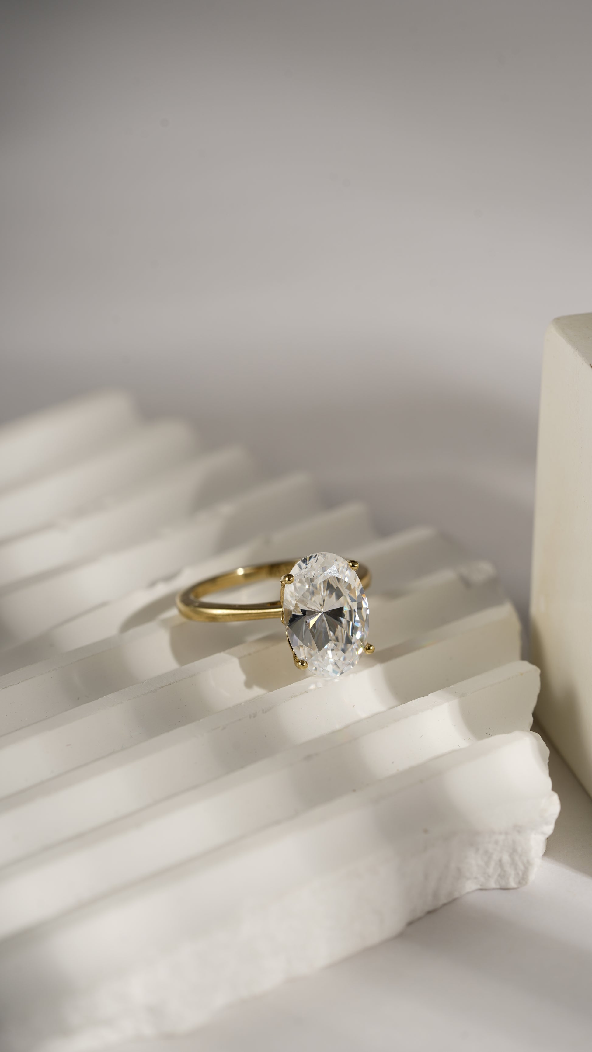 This stunning solitaire ring shines with a 100-facet solitaire stones, radiating maximum brilliance and captivating light. Crafted from solid 925 sterling silver and plated with 14k yellow gold, this ring guarantees a long-lasting, lustrous shine.