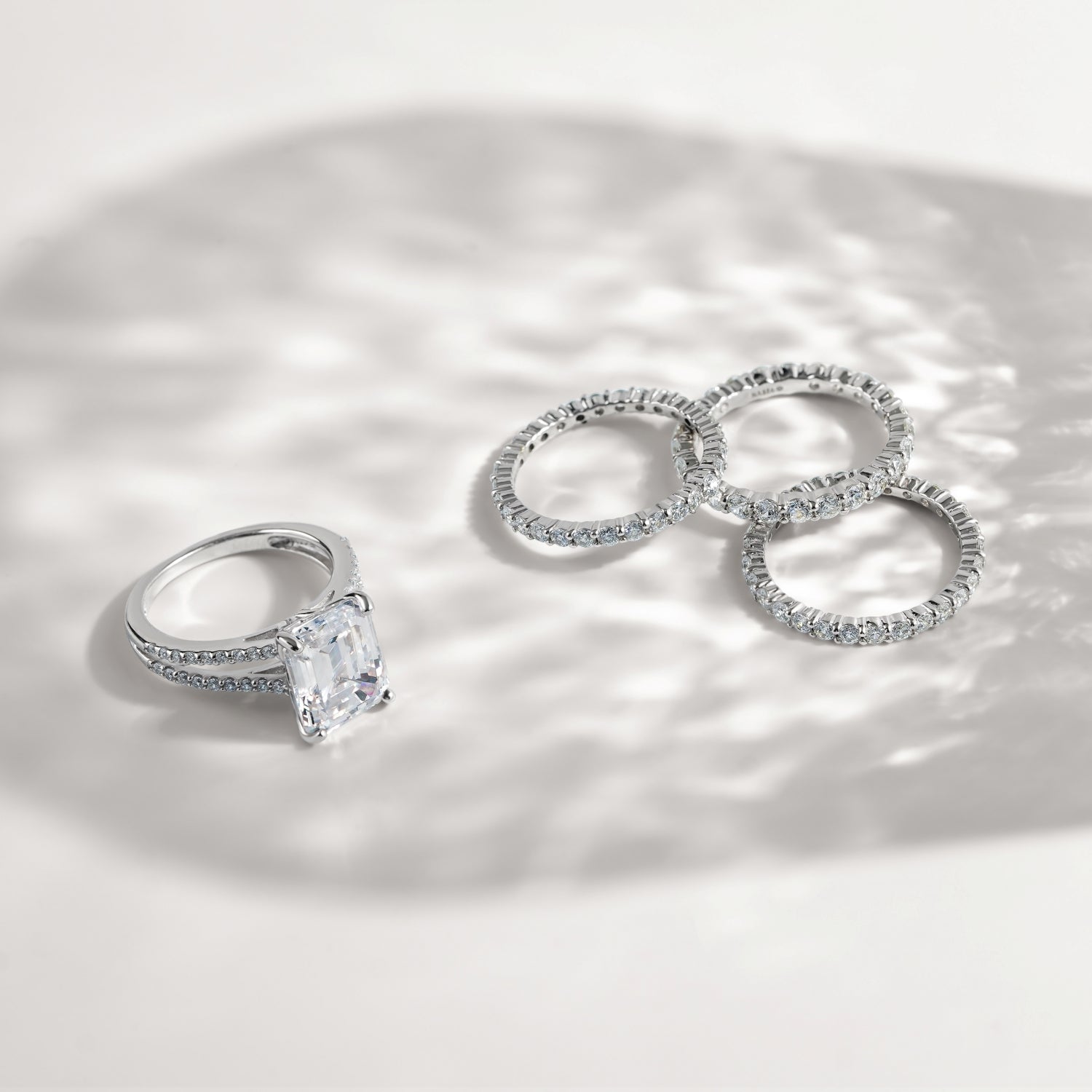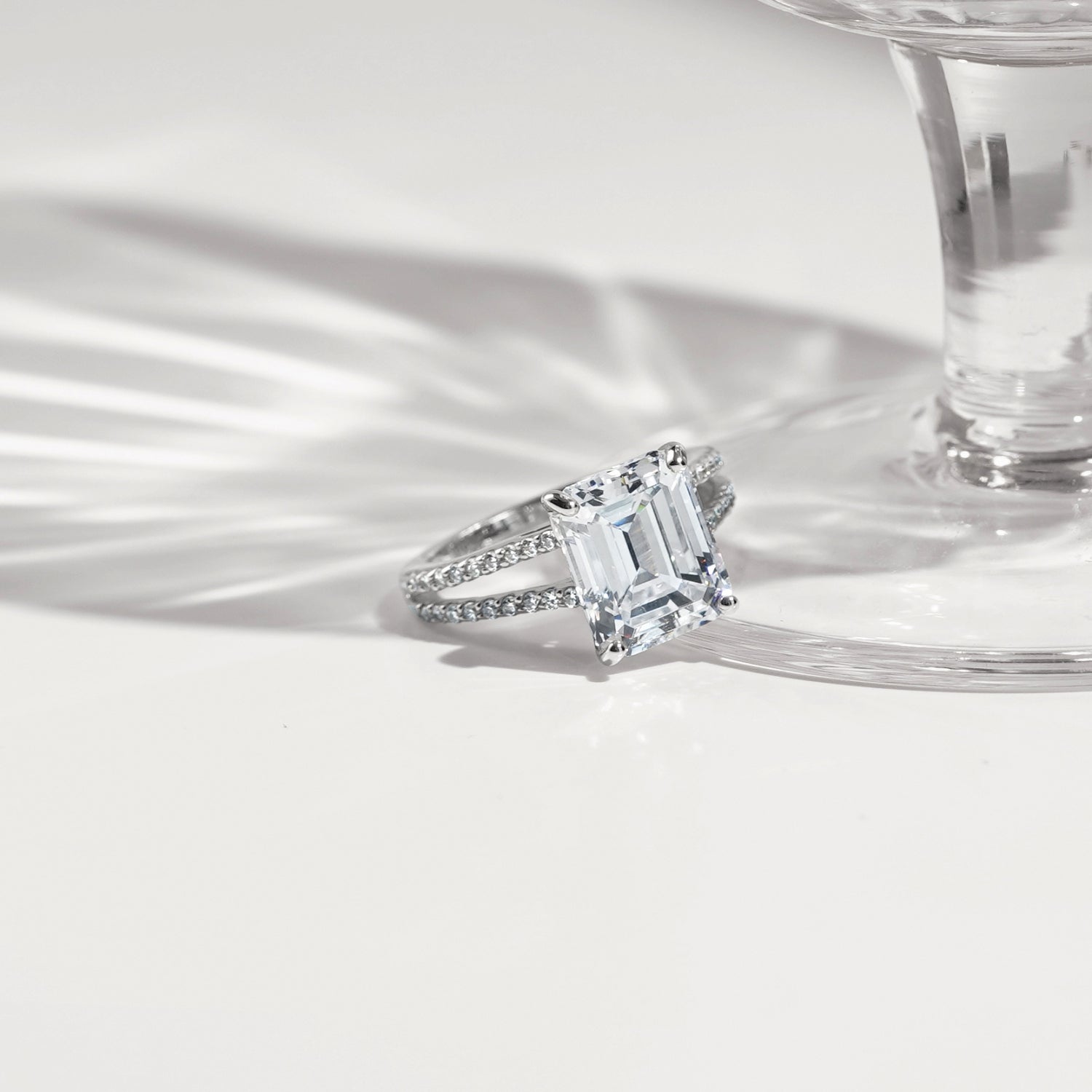 This Diamonbliss ring showcases a large 11 x 9 mm emerald cut surrounded by 1.25mm round cuts on the shanks. The split shank adds a delicate touch to the overall design.