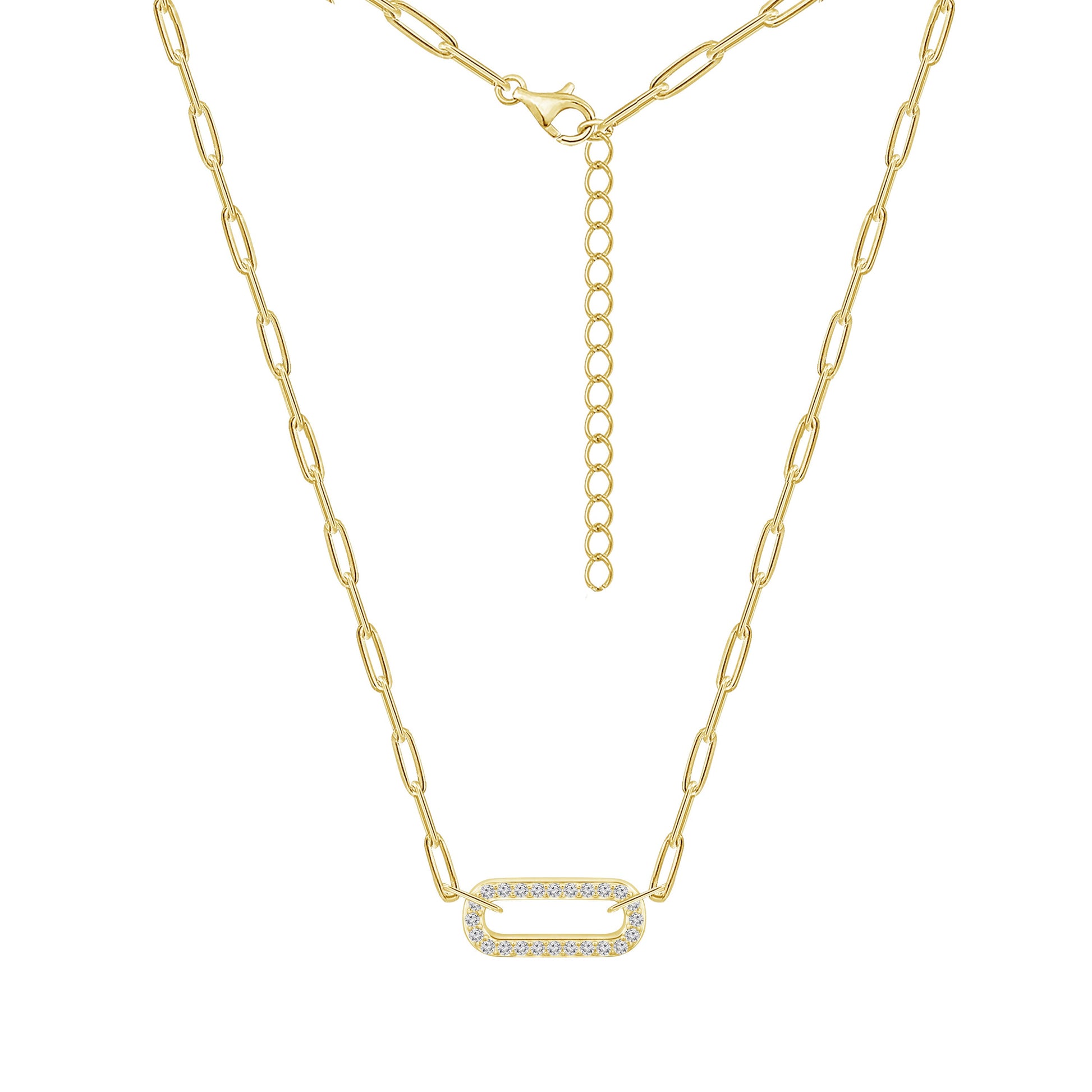 Stunning cubic zirconias on a prong set are featured on this versatile Halo Necklace, complete with a paper clip chain.