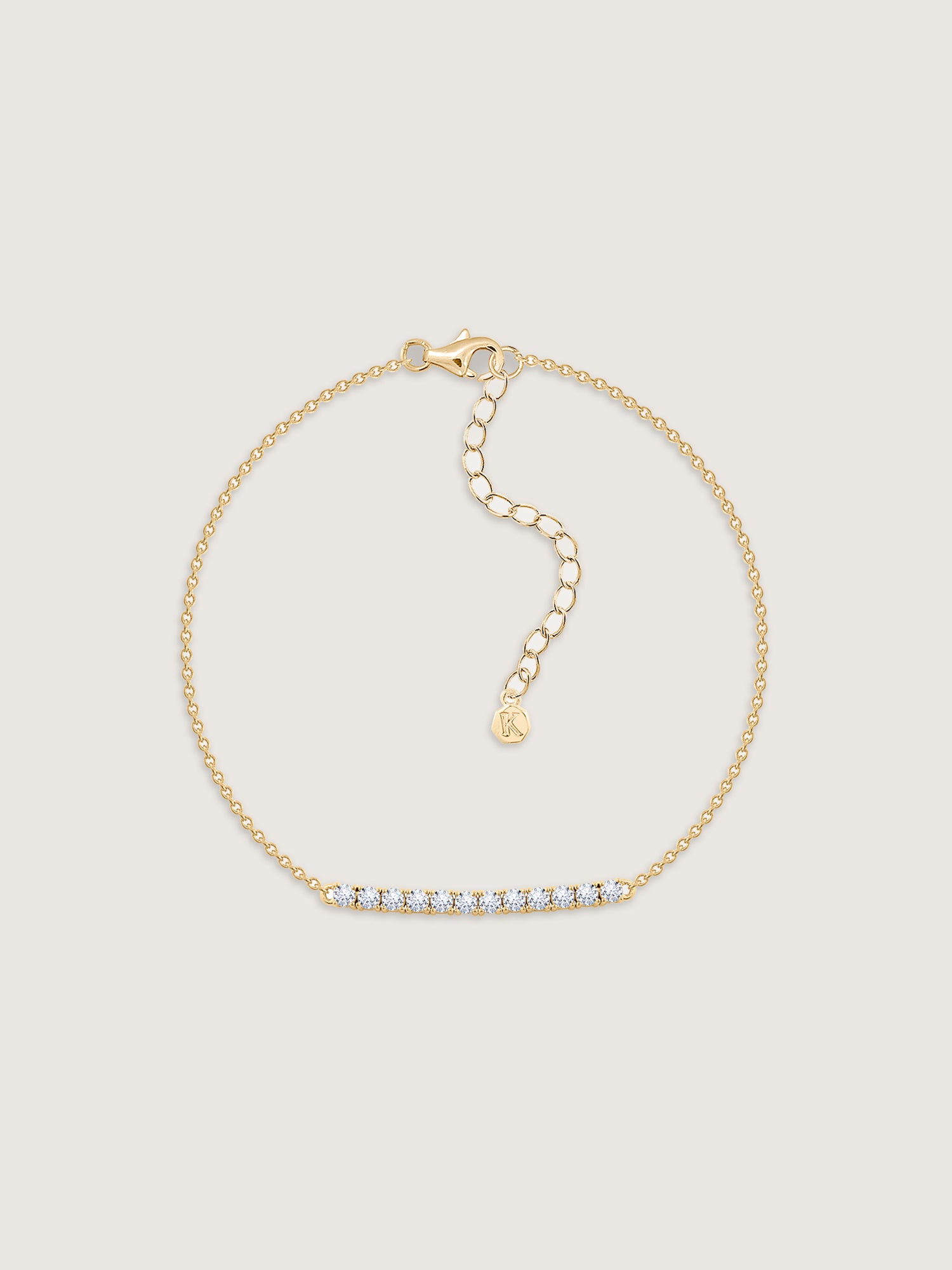 Experience a modern twist on traditional fashion with the Horizontal Round Bar Bracelet. Elevens sparkling baguette diamonds are beautifully set in 14K yellow gold, adding a touch of radiance to your wrist.