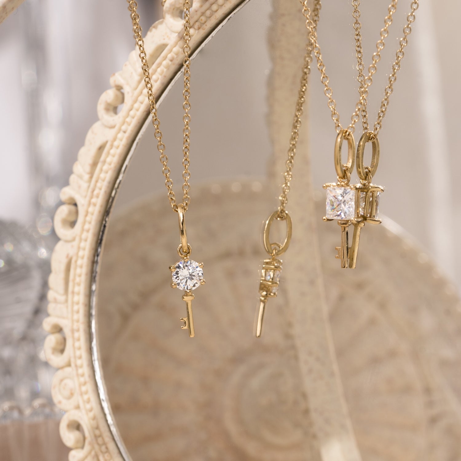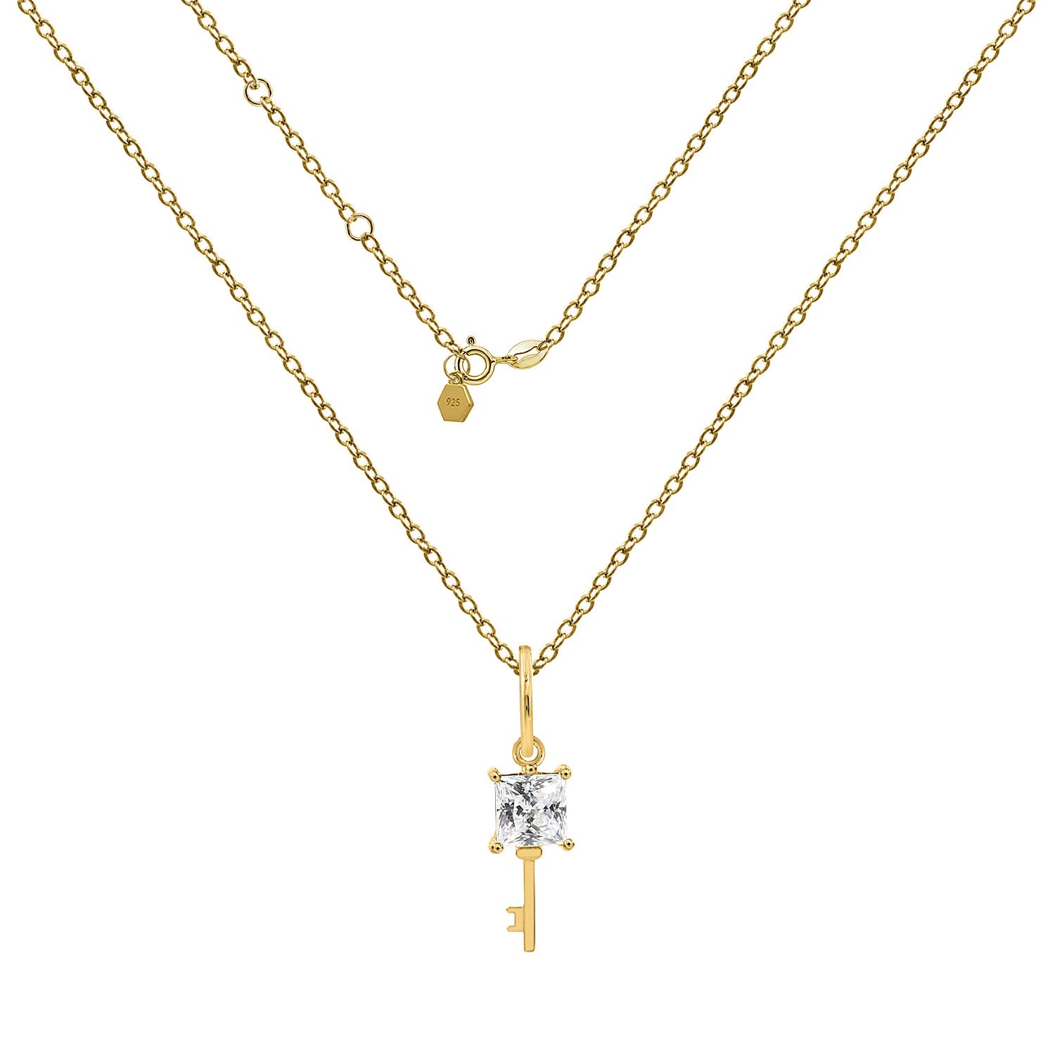 Crafted in sterling silver, this key-shaped design features CZ stone. Buffed to a brilliant luster, this pendant suspends along an 18.0-inch cable chain that secures with a spring-ring clasp.