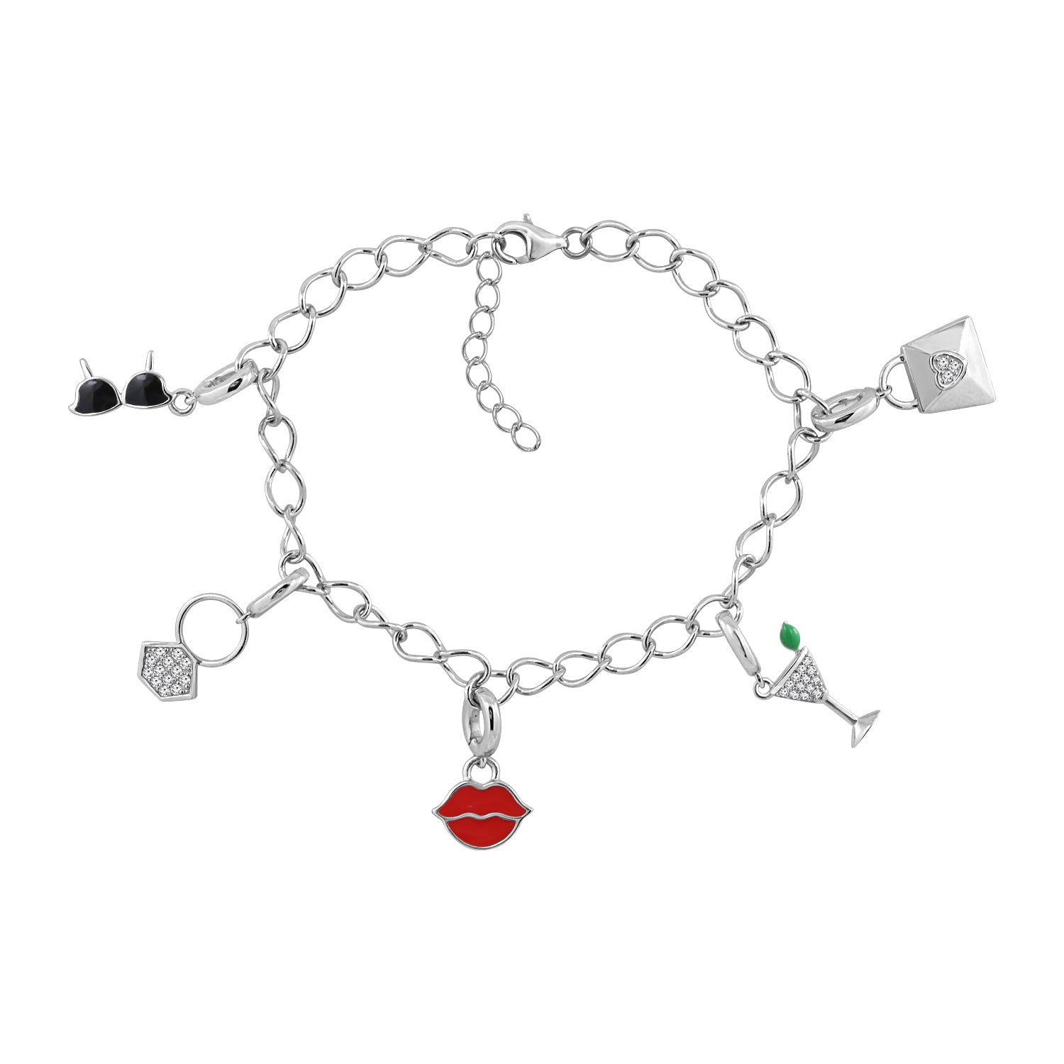 Add a playful twist to your jewelry collection with our charms silver chain bracelet. Crafted from polished platinum plated sterling silver, this eye-catching piece features a bold chain design adorned with a mix of fun and glamorous charms—including red enamel lips, a sparkling martini glass, a Cubic Zirconia-accented envelope, and more. Each charm brings its own personality, making this necklace the perfect accessory for nights out, parties, or whenever you're feeling bold and stylish. Adjustable for a custom fit and secured with a lobster clasp, it’s a conversation starter you’ll love wearing again and again.