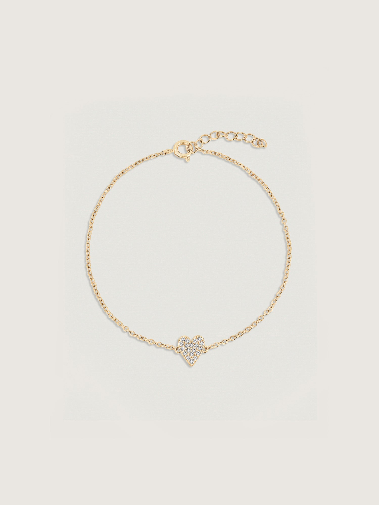 Delicate and effortlessly elegant, this heart bracelet adds a subtle sparkle to your everyday look. Featuring a finely crafted chain and a pavé-set heart charm, it catches the light beautifully with every movement. The adjustable clasp ensures a comfortable, personalized fit, making it perfect for layering or wearing on its own. A timeless symbol of love and warmth, this bracelet is an ideal gift—or a meaningful piece to cherish yourself.