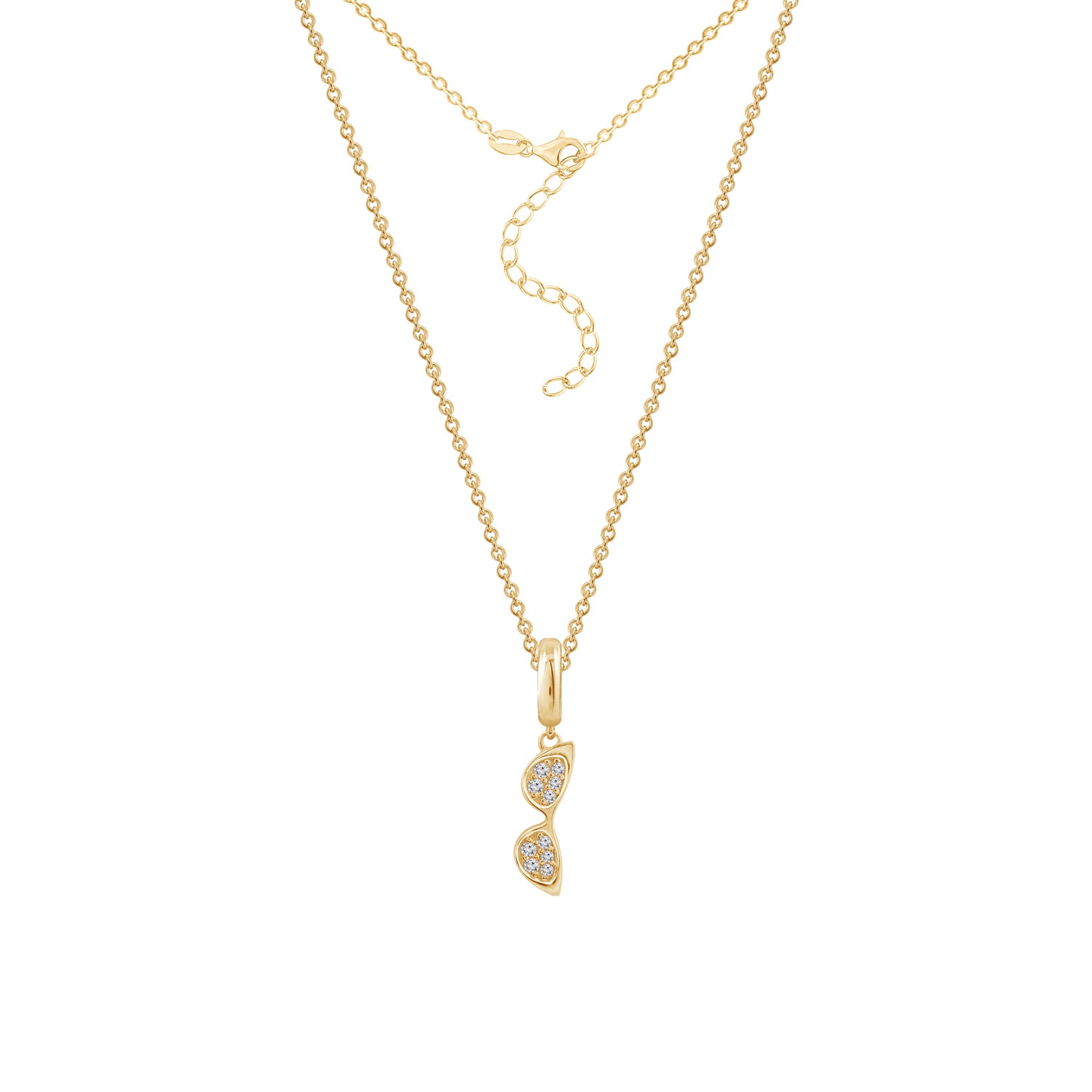 Add a touch of sunny charm to your jewelry collection with this gold-plated sunglasses pendant necklace. Featuring a sleek miniature sunglasses charm accented with sparkling Cubic Zirconia stones, this playful piece brings personality and shine to any look. The dainty chain and polished finish make it perfect for layering or wearing solo.