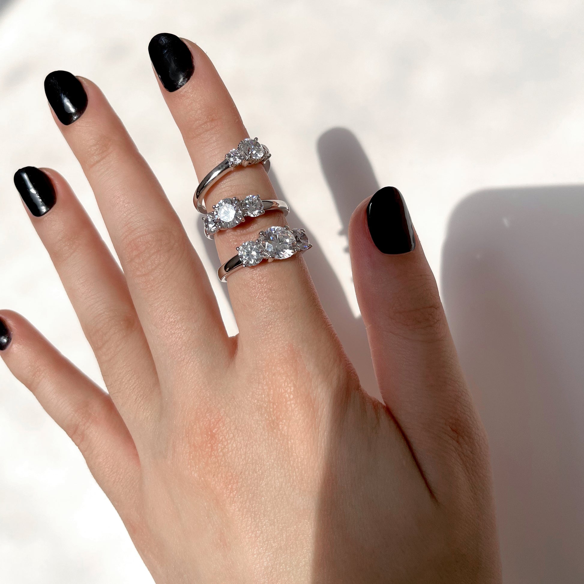 Featuring the traditional graduated style, this three-stone ring is truly a classic. Representing friendship, love, and fidelity, or past, present, and future.