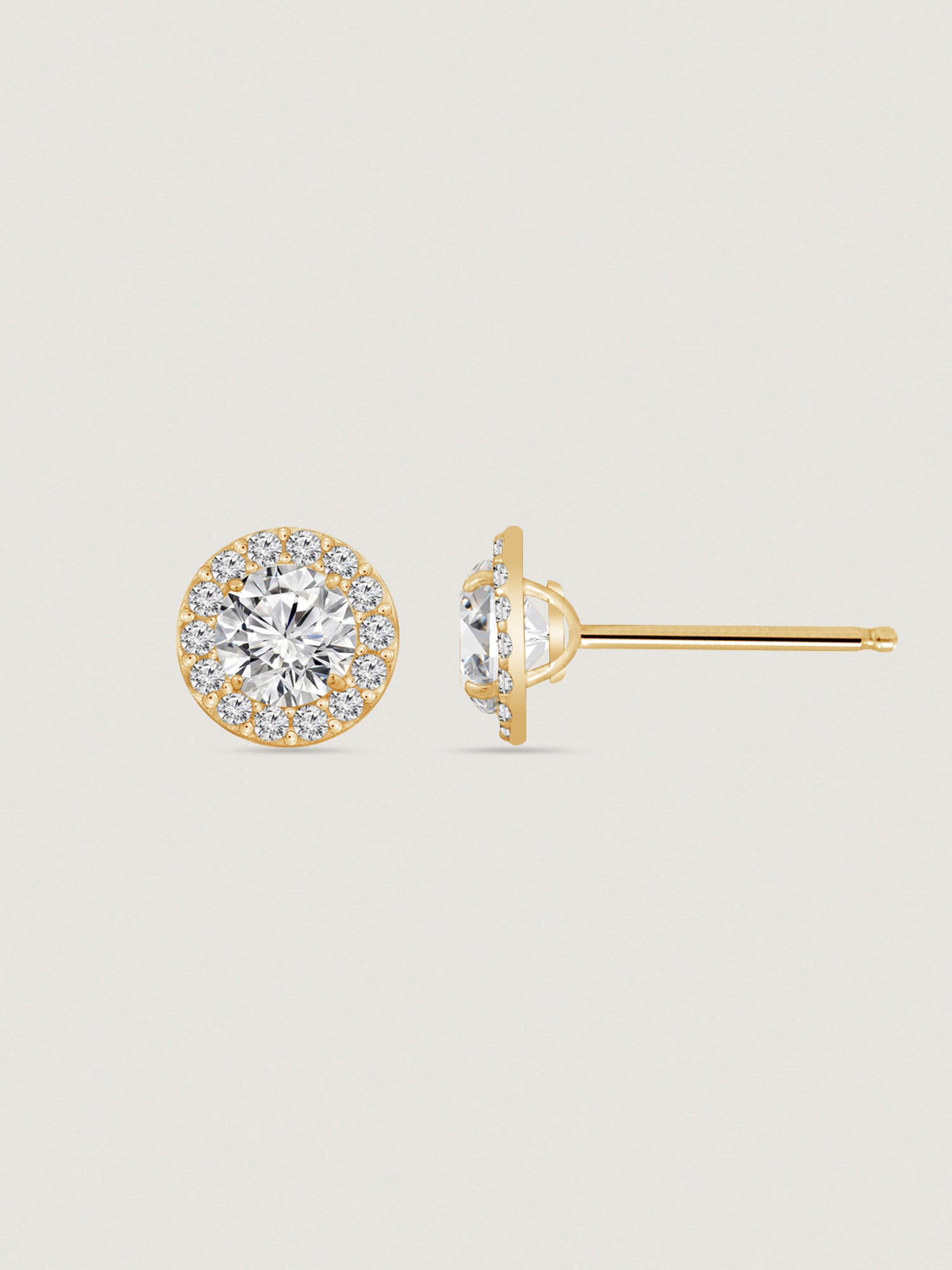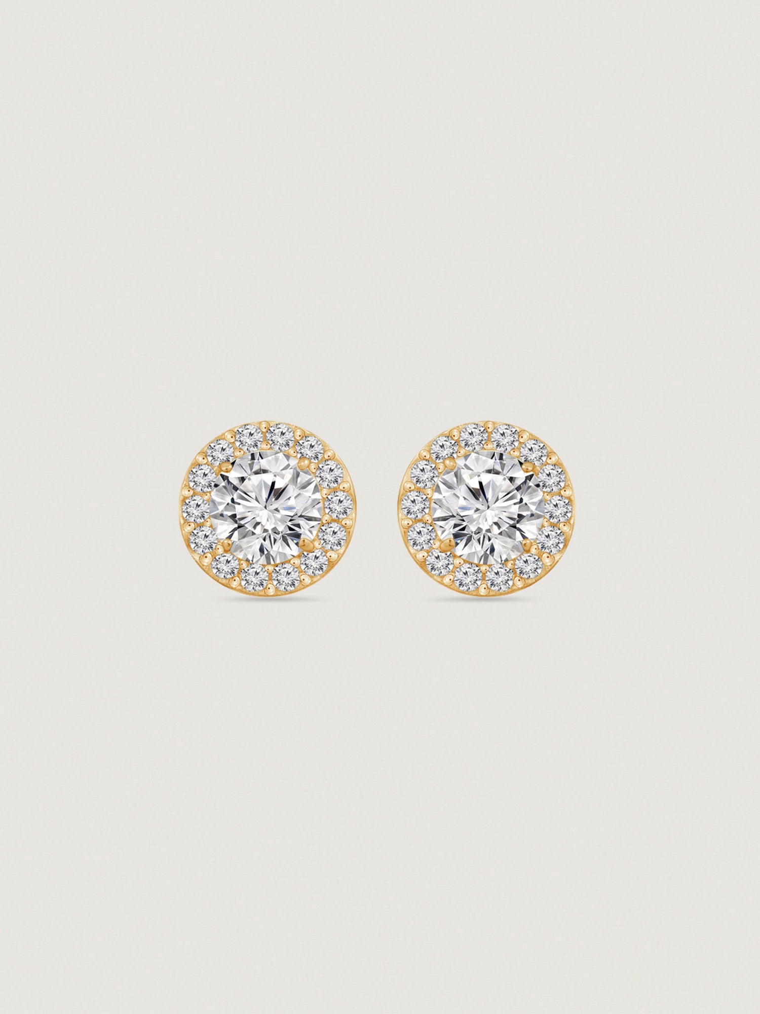 Crafted with solid gold and the most brilliant stones in a halo setting, these classic studs are what we call understated luxury. Pair them with our solid gold halo pendant necklace to complete your look.