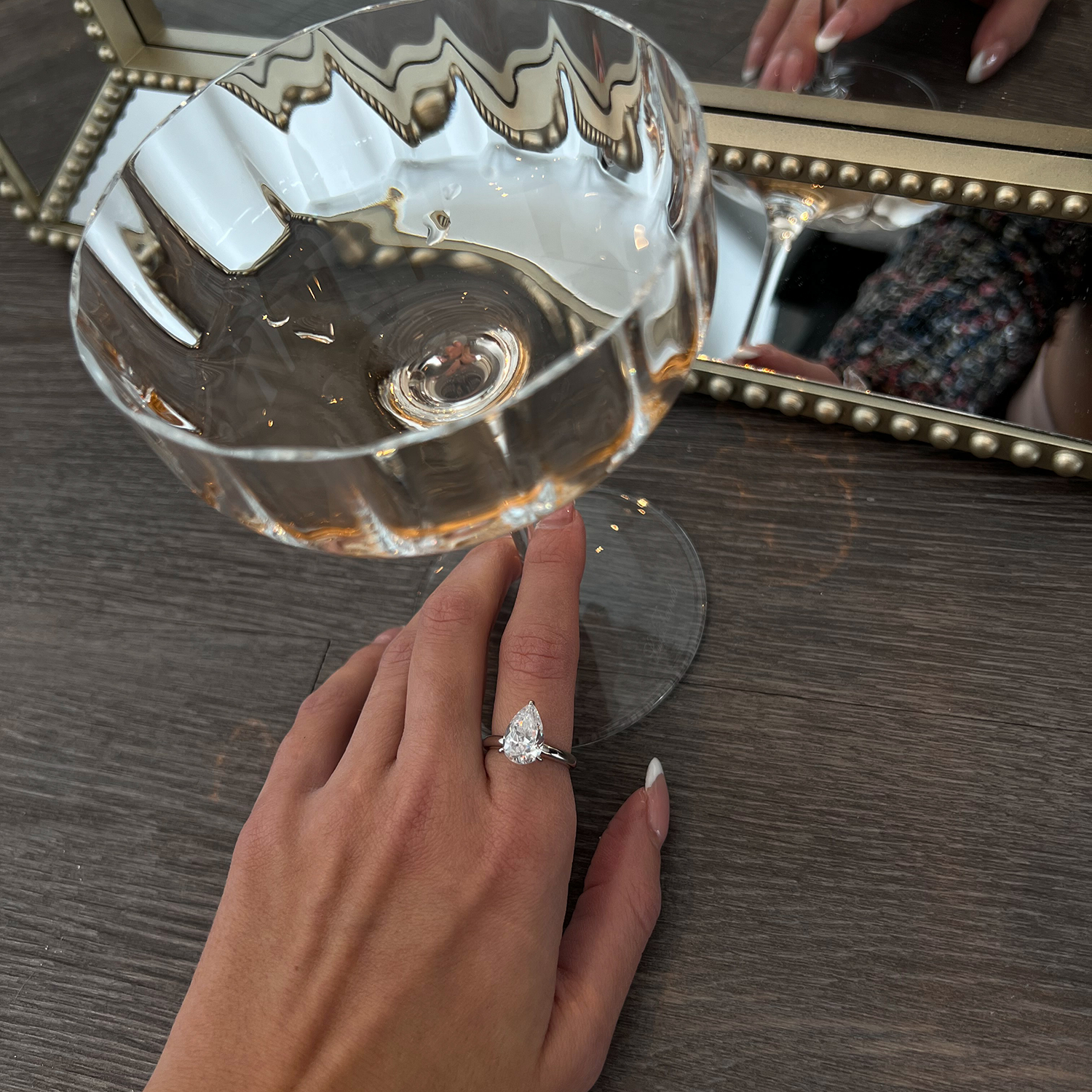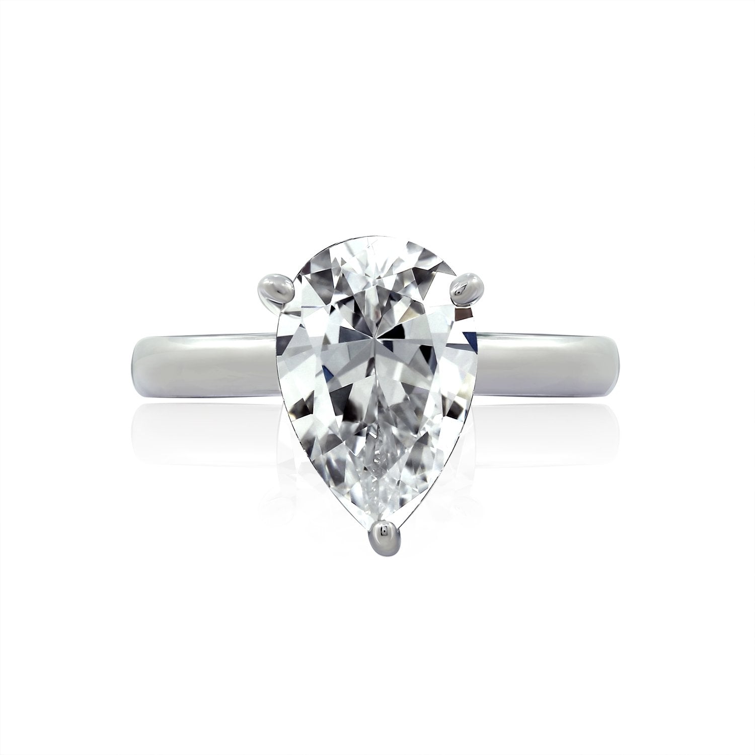 A three-claw solitaire style, this ring is set in platinum plated sterling silver and featured a pear-shaped diamond. As a combination of round and marquise cuts, the pear stone is a balance of perfect proportion and an effort to slim down and elongate your fingers. Symbolizing the most precious moments in life, this solitaire ring can be a meaningful gift for your beloved or simply a treat for self-indulgence.