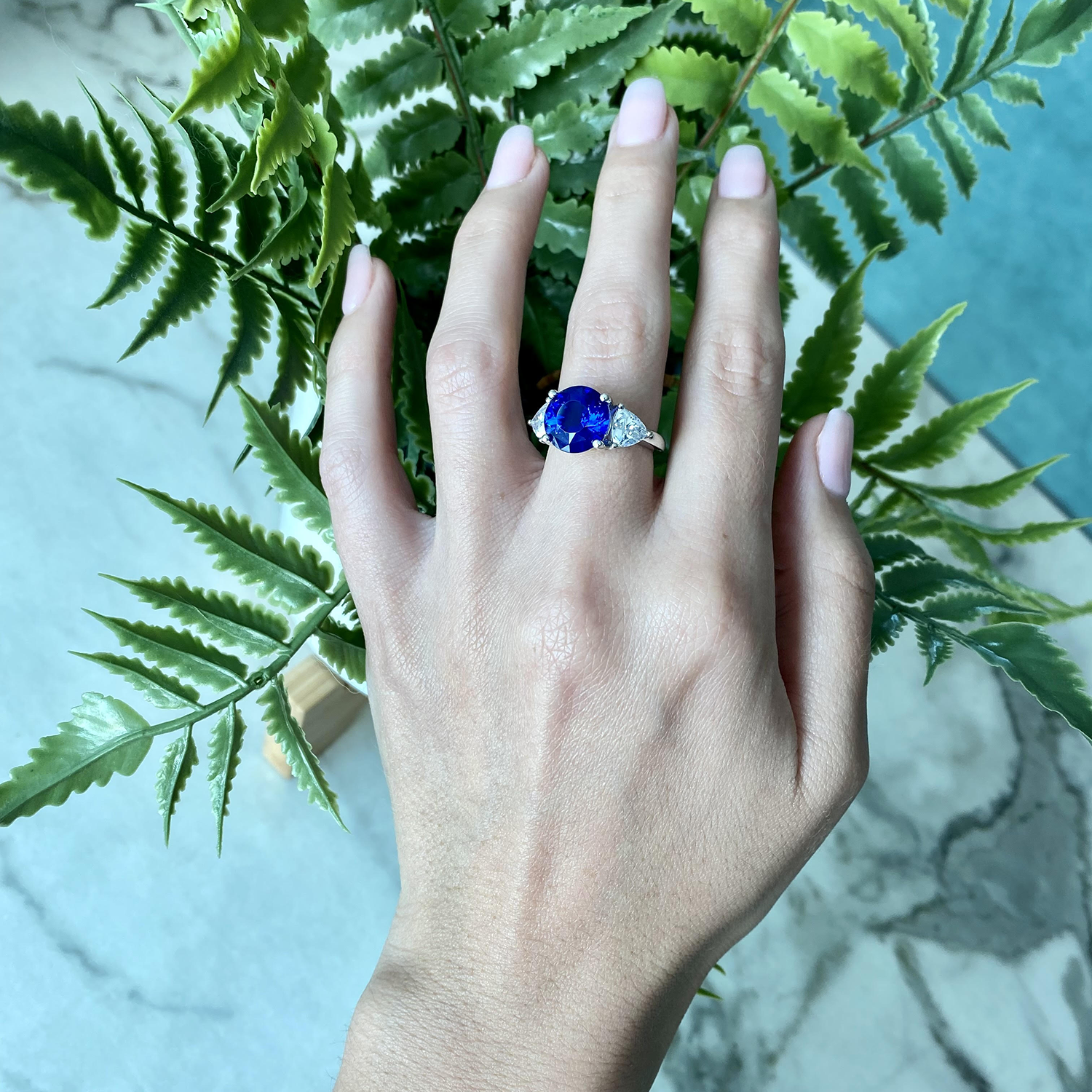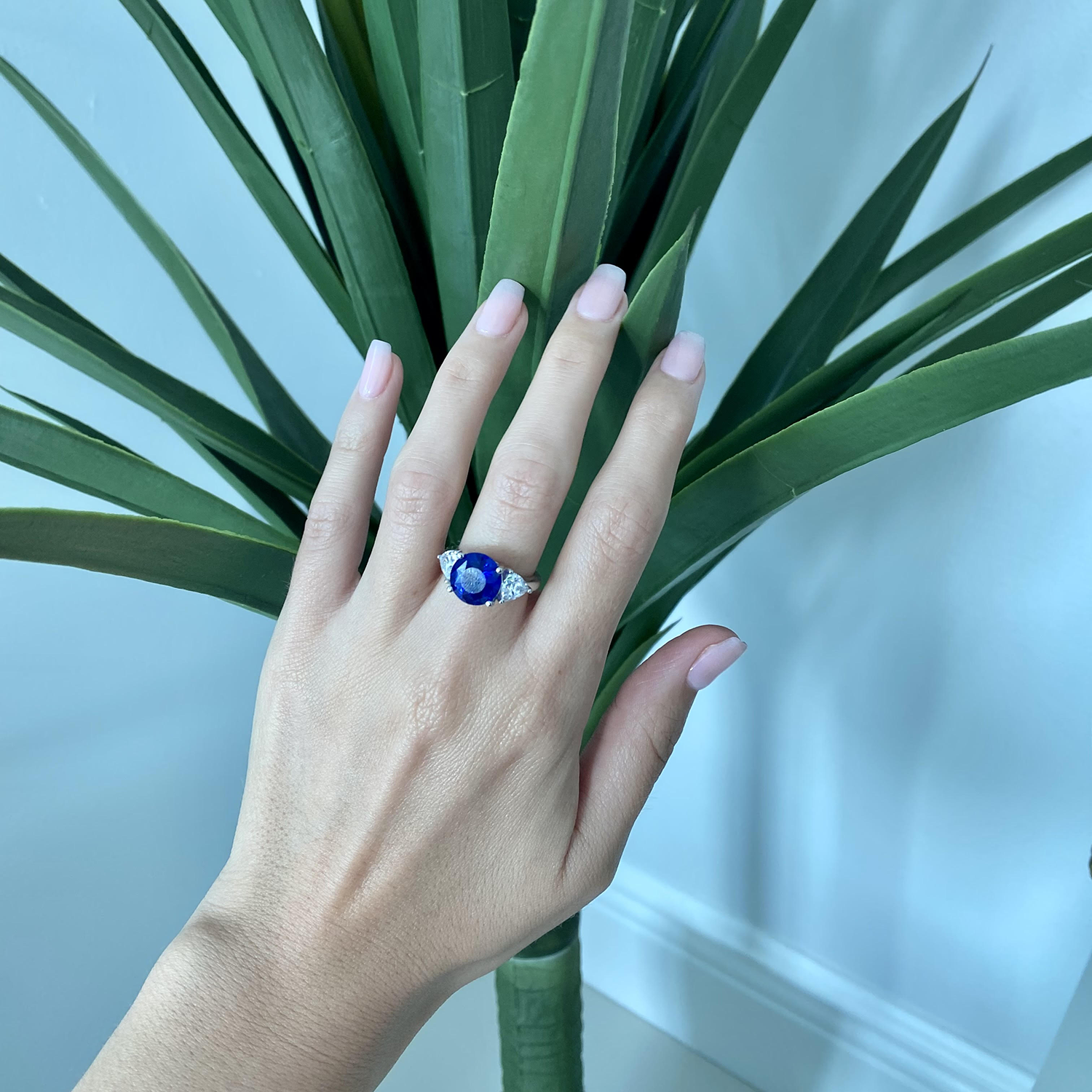 Sleek, colorful, and oh-so feminine, this solitaire CZ ring is a wonderful choice for the woman you love. Crisp engagement ring design featuring CZ & Sapphire Platinum Plated Round Cut in a delicate one-row diamond band set gives the illusion of eternity. This cute ring looks so much like a genuine diamond, this stunning ring total carat weight about 5ct, that it would be the perfect alternative for an extremely expensive authentic diamond ring, or as a replacement wedding ring to wear when traveling.